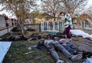 Zelenski publicó la imagen de una mujer arrodillada junto a lo que parece ser un cadáver, con varios cuerpos a su alrededor.