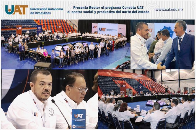 El Rector de la Universidad Autónoma de Tamaulipas, Guillermo Mendoza Cavazos, presentó en el Gimnasio Multidisciplinario de Reynosa la Gira Conecta UAT, ante representantes de los sectores productivos y sociales de municipios de la zona norte del estado.