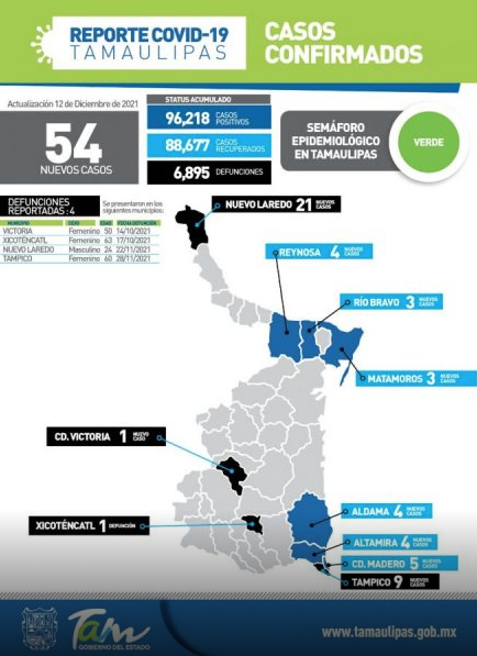 Tamaulipas cerró la jornada de este domingo con 54 pacientes positivos a COVID-19 y 4 víctimas mortales asociadas a complicaciones graves por el virus, informó desde esta ciudad capital la secretaria de Salud Gloria Molina Gamboa al actualizar el estado de la pandemia.