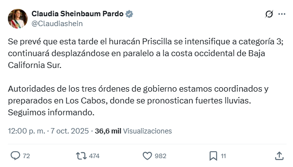 La presidenta Claudia Sheinbaum alertó sobre la peligrosidad del huracán ‘Priscilla‘.