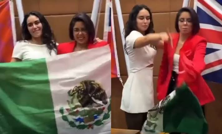 Ambas posan abrazadas y con una bandera de México que toman de un extremo, para luego dejarla caer, aunque la actitud de la gimnasta es la que causó molestia porque es quien la lanza al piso.