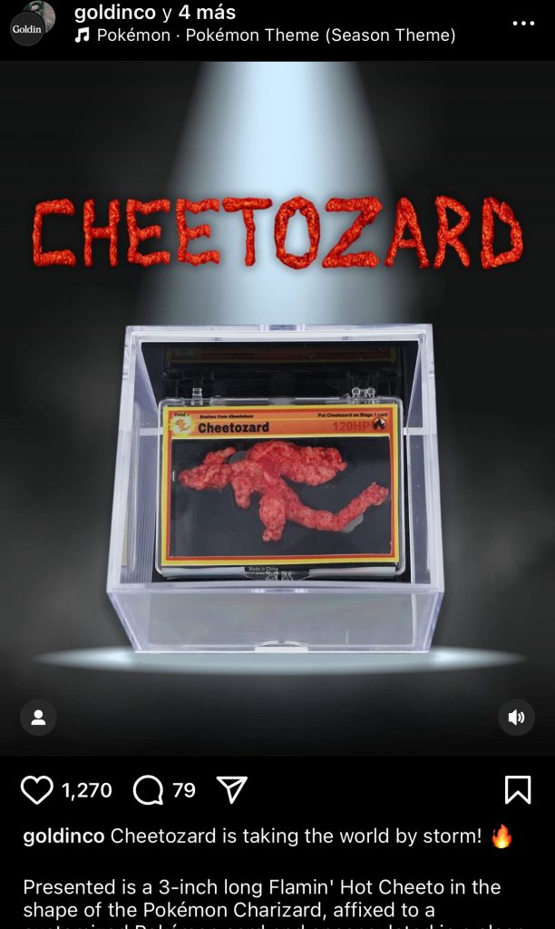 “Se presenta un Cheeto Flamin’ Hot de 7.6 centímetros de largo con forma del Pokémon Charizard, fijado a una tarjeta personalizada de Pokémon y encapsulado en una caja de almacenamiento de tarjetas transparente”, indica la descripción de la subasta.