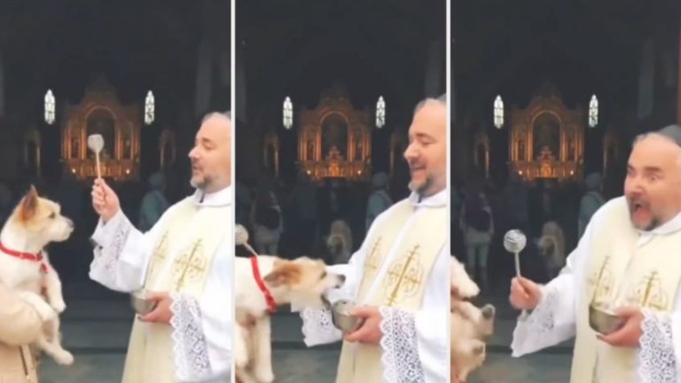“Señor, que tu bendición descienda sobre esta criatura y sobre quienes la cuidan… ¡Mierd*…! Perdón, el susto que me ha dado, madre mía”, gritó el sacerdote asustado mientras se apartaba del perrito que fue alejado por su dueña, quien también intentó justificarlo diciendo que el perrito estaba nervioso.