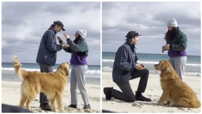 Recientemente, un video de poco más de un minuto se ha vuelto viral en redes sociales al capturar una propuesta de matrimonio tan emotiva como espontánea, con un inesperado protagonista: un perro tipo golden retriever que acompaña a la pareja en la playa.